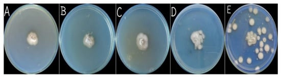 Growth inhibition of pathogenic fungi at different concentrations 25 mg/mL (A), 50 mg/mL (B), 75 mg/mL (C), 100 mg/mL (D), and 0 mg/mL (E) of zinc oxide nanoparticles.