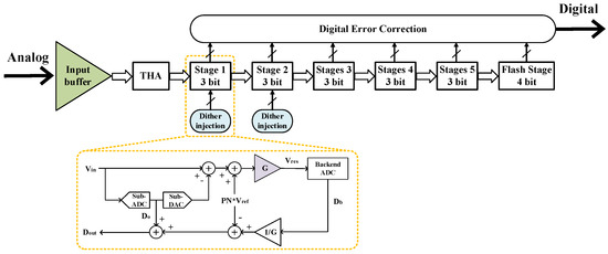 The demand for systems with faster transmission rates and higher signal quality has experienced significant growth as millimeter-wave wireless, radio, and cellular communications continue to expand. This expansion has necessitated the development of broadband ADCs with bandwidths beyond GHz and high accuracy for digitizing Intermediate Frequency (IF) signals or sampling directly at Radio Frequency (RF) [1,2,3,4,5]. In the field of communications protocols, radar scanning, and electronic measurements, the detection and decoding of weak signals play a central role in differentiating system performance. Spurious-Free Dynamic Range (SFDR) represents the minimum power signal that can be distinguished from large interfering signals, making it critical to distinguish signals from other noise and spurious frequencies. Among various conversion architectures, such as flash, folding, and successive approximation registers (SAR), pipelined conversion designs offer the most favorable balance between conversion speed, resolution, and suitability for wide bandwidths, high precision, and high sampling rates.