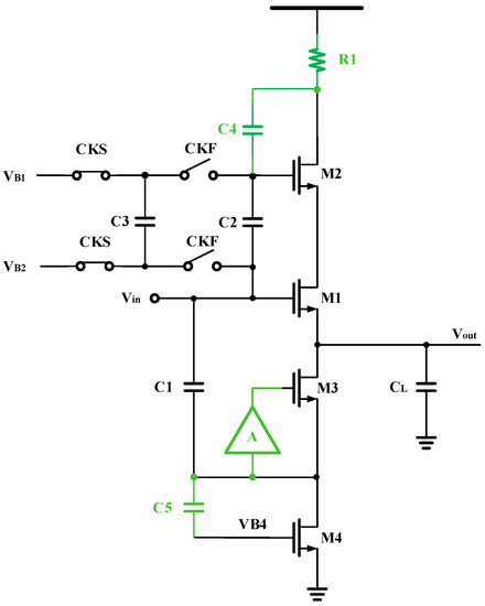 When Vds changes, Vgs will also change, assuming I remains constant. To address this issue, the research [3] advises employing a switching capacitor as a level converter to maintain constant Vds. Additionally, to enhance the stability of Equation (1), it is also required to impose a limit on I while maintaining Vds at a constant value. C4 and C5 are also added to reduce current variation, creating a negative feedback loop through the capacitor connected to M4, which can partially suppress the current variation. For this structure, its voltage transfer function can be expressed as:
