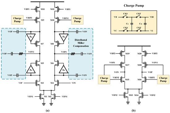 To attain a high gain, telescoping cascode amplifiers with a gain boost structure has been employed extensively in the past [4]. This design employs a two-stage cascaded amplifier topology, wherein the first stage utilizes a standard gain bootstrap while the second stage offers a large bandwidth. To further enhance the performance of the amplifier, an additional charge pump is introduced between the input and the conventional amplifier-based cascade device. This charge pump is driven by the non-crossover clocks CKS and CKF. By periodically charging and discharging the load tube gate capacitor to generate an additional AC signal input and the associated bias voltage. During CKF operation, the voltage difference between VB and VC is maintained across CB. CI’s value determines the ripple’s magnitude and stabilization time, necessitating CI to be significantly smaller than CBI. When the transconductance of M3 and M9 is comparable, the associated Gm actually doubles, and the nmos and pmos cascade structures become each other’s output impedance. This configuration results in an increase in the high-frequency and small-signal gain of this stage. The fixed deviation between the P- and N-terminal input devices can be maintained by multi-cycle capacitor charging and discharging, which expends the signal swing.