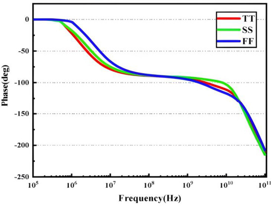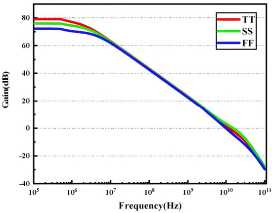 The developed amplifier’s loop frequency characteristics are simulated under various PVT settings to ensure its stability, and the results are displayed in Figure 5 and Figure 6. The phase margin exceeds 60, the GBW reaches 11.002 GHz, and the low-frequency loop gain is 72.07 dB.
