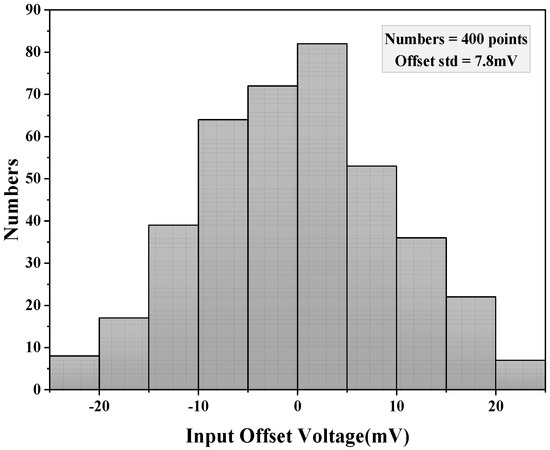 An engineered trim method is used on the comparator to enable manual adjustment for compensating offsets resulting from manufacturing during the final test. Control ports such as P<1:0> and N<1:0> are added to the gate of the preamplifier output load for external offset calibration. Therefore, each comparator incorporated within the developed ADC possesses the capability to modify its offset voltage using SPI command control. The adjustment level can be determined by observing the residual error curve of the MDAC at different levels. It is possible to control the working state of the circuit, reducing the offset voltage without affecting the performance of the circuit. The results of the Monte Carlo simulation are depicted in Figure 8 and the comparator’s offset voltage is 7.8 mV.