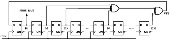 A pseudo-random sequence and switches are used for dither injection. Therefore, within the first two MDAC stages, the pseudo-random binary sequence (PRBS) generator is used. This generator utilizes a linear feedback mechanism, employing a cascade of multiple flip-flops, to produce a periodic distribution of zeros and ones, as well as an autocorrelation characteristic similar to white noise in the frequency spectrum. As an example, a 32-bit PRBS generating circuit implementation is shown in Figure 9.