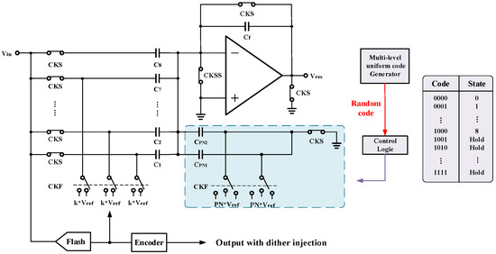 Dither injection can be used to reduce harmonics and noise generated by jitter signals within the ADC, thereby optimizing the spectrum to improve the ADC’s output performance. There are two different bandwidth-based jitter methods. One is wideband dithering, which utilizes a dither DAC and a pseudorandom number (PN) generator to generate the dithered signal. The jitter signal added to the input must be digitally removed from the output to prevent degradation of the signal-to-noise ratio. Another method is narrowband dithering, which involves a broadband noise source and an analog low-pass filter to generate the dither signal outside the target band. Out-of-band jitter also needs to be removed during the post-processing of the digital filter applied to the ADC output. The extensively discussed dithering techniques are based on the first method. The dithering mentioned in [14], although not limited to the bandwidth, sacrifices some available signal bandwidth and dynamic range in the frequency domain. Ali et al. [15] mentioned an injection method applicable to pipelined ADCs, enabling a dithering injection technique for residual nonlinear signals. However, the details of the specific circuit implementation are not described in the paper.