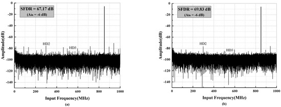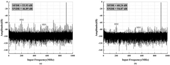 Figure 13 presents the fast Fourier transform (FFT) spectrum obtained from measuring the ADC sampling a 2 GHz input signal at 900 MHz. The spectrum illustrates the performance limits of HD2 and HD3. After calibration, as depicted in Figure 13b, the spurious signals are mitigated, resulting in an improved spurious-free dynamic range (SFDR) of 68.24 dB, while the achieved signal-to-noise and distortion ratio (SNDR) reaches 54.87 dB. As the input signal decreases, HD2 and HD3 generally improve as the square and tube of the signal reduction. Consequently, the SFDR can quickly become limited by residual spurs. When the dithering mode is enabled, as shown in Figure 14, the SFDR further increases from 67.17 dB to 69.83 dB, while SNDR experiences a slight decrease.