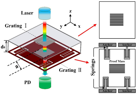 The optical mechanism of the in-plane grating-Talbot-based accelerometer is schematically described in Figure 1. When the laser light (model MDL-Ⅲ-1550, 1550 nm wavelength, with a collimated diameter of 800 µm) propagates to grating Ⅰ, the light travels through it and arrives at grating II (the interval of gratings is d0), and is deposited on the proof mass. The light is directly transmitted by grating Ⅱ, and this forms the Talbot effect of near-field diffraction. We record the diffraction intensity beneath the dual-layer gratings. The accelerometer structure consists of proof mass, dual-layer gratings (with the side length of a), spring beams and anchors. When it senses the acceleration in the X direction, the proof mass will be removed from its initial position, resulting in bending and distortion in the four spring beams, and the proof mass will move horizontally relative to grating Ⅰ along with the lateral movement of grating II in the sense direction (under the condition of ignoring the influence of cross-axis sensitivity). The relative position variation in dual gratings will lead to an intensity difference of near-field diffraction. Thus, the change can be measured to obtain the acceleration, which is detected by a photodetector (PD).