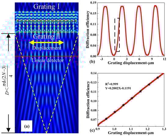 (a) The Talbot pattern of dual-layer diffraction gratings. (b) Simulation curve for the diffraction efficiency versus the displacement along the sensitive axis of accelerometer. (c) Linear fitting for the diffraction efficiency curve in the linear region of (b).