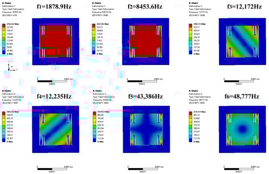 Another important parameter of a MOEMS accelerometer is the operating bandwidth, which depends on the characteristics of mechanical structure. In order to calculate this parameter, we analyzed the resonant frequency of the accelerometer, which depends on the stiffness and proof mass [34]. Figure 3 shows the mechanical mode of the proposed accelerometer. The stresses are concentrated in the beam structure. The mass in the sensing direction is 15.3 mg, and the elastic coefficient is K = 1343 N/m. When the structure withstands an acceleration of 200 g, it reaches the allowed stress of silicon. The first mode frequency of the accelerometer is 1878.9 Hz, and the second, third and fourth mode frequencies are 8453.6 Hz, 12,172 Hz and 12,235 Hz, respectively. The resonant frequencies of other modes are far from the working mode, avoiding the coupling of other modes with the working mode and effectively suppressing the cross-axis sensitivity induced by other different modes. The bandwidth of the accelerometer is 626.3 Hz.