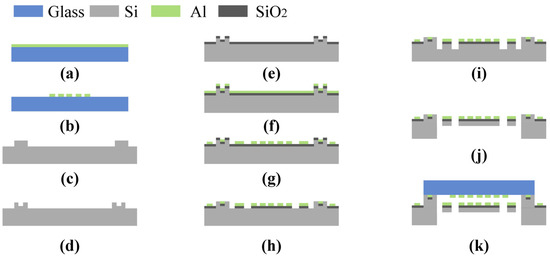 The detailed fabrication of the MOEMS accelerometer using micro-nano technology is shown in Figure 4. Highly reflective films composed of aluminum are first patterned on the glass substrate using magnetron sputtering (Figure 4a). Then, the upper grating layer is fabricated by dry etching after spin coating a 1.5 μm thick photoresist (AZ5214) for photolithography (Figure 4b). To ensure the interval of the dual-layer grating, we etched a 10 μm shallow groove in the center of the silicon substrate (Figure 4c). For the subsequent electrostatic actuator and anodic bonding, the electrode grooves were etched by reactive ion etching (RIE) (Figure 4d). A 300 nm thick SiO2 layer was grown by PECVD to prevent conductivity of the electrodes to the wafer (Figure 4e). Though magnetron sputtering, spin-coating of a photoresist and photolithography, the lower grating and Al wires were also fabricated by metal dry etching (Figure 4f,g). The cantilever beams were also etched with deep reactive ion etching (DRIE) after wet etching the SiO2 layer (Figure 4h,i) and then releasing the sensitive structure (Figure 4j). Finally, the micro-grating layer and the structure layer were combined together via anodic bonding (Figure 4k).
