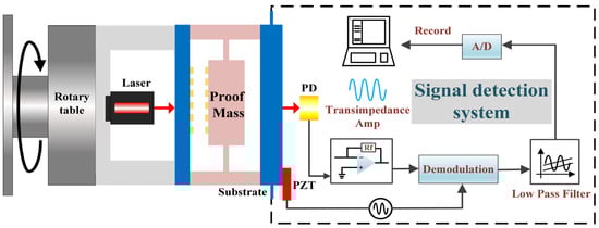 A block diagram of the experimental setup for the static acceleration measurement test of the proposed accelerometer is shown in Figure 5. All of these configurations were mounted on a high-precision rotary table (model. AP180/M, Thorlabs, Shanghai, China) that generates input accelerations by rotating the table from 0° to 90°, which means that the input accelerations can be applied between 0 g and 1 g. A frequency-stabilized laser with a power of 1.1 mW served as the light source in our configuration, and the transresistance resistor of PD is 1.8 kΩ. To reduce the impact of frequency noise on device performance, we used phase-modulation techniques to suppress 1/f noise and other ambient noise. As shown in Figure 5, the realization of phase modulation requires a piezoelectric ceramic transducer (PZT), signal generator, demodulation module, low-pass filter and processing circuit. The signal generator sends two identical signals to a PZT and demodulation module, respectively. The diffraction intensity detected by the PD is modulated by applying a signal voltage to the PZT, then demodulated by multiplying the same frequency sinusoidal signal and loaded on low-pass filter and A/D converter to be recorded in the computer.