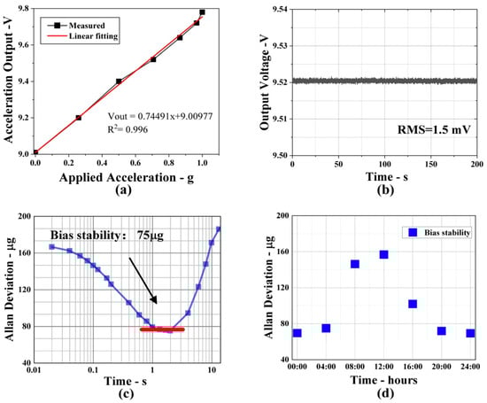 (a) Measured scale factor of the MOEMS accelerometer is 0.74 V/g. (b) The output voltage and RMS deviations of the accelerometer when the applied acceleration is invariable. (c) Modified Allan deviation of accelerometer. (d) Bias stability recorded at different times of the day.