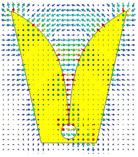 The director is loaded inside the tapered slot of the initial Vivaldi antenna, which increases the gain of the antenna without changing its size. When the Vivaldi antenna is fed, the radiation electric field produced by the antenna points from one side of the tapered slot to the other side, that is, the radiation electric field is along the x-axis. The electric field of the antenna obtained by CST Studio Suite (CST) software simulation is shown in Figure 2. The director structure can be viewed as a metal wire. When the director is inserted onto the substrate in the middle of the tapered slot, the induced current is generated on the director due to the parallel orientation of the electric field and the director, which plays a role in directing the radiation electric field, as shown in Figure 3.