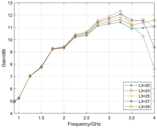 Based on the above principles, the influence of different lengths of the directors on the antenna gain are compared, as shown in Figure 4, and the length of the director is finally determined to be 25 mm. Additionally, by continuously optimizing the position of the directors, the final structure of the Vivaldi antenna loaded with the directors is shown in Figure 5. Figure 6 shows the comparison between the gain results obtained by simulation with and without the directors. From the simulation results, the gain of the Vivaldi antenna loaded with the directors is significantly improved at high frequency, but the improvement on the low-frequency band is not obvious. Because, at low-frequency, the radiation position of the Vivaldi antenna is close to the aperture or even ahead of the position of the directors, the improvement effect is not obvious.