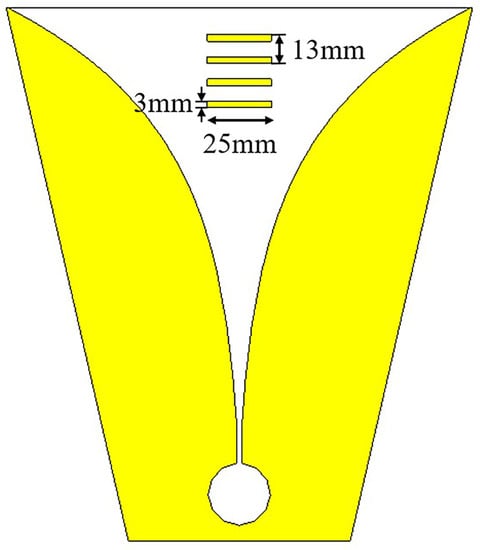 - Huang, X.; Cao, J.; Zhong, W.; Jin, X. High gain antipodal Vivaldi antenna with novel V-shaped air-slot. Int. J. RF Microw. Comput.-Aided Eng. 2021, 31, e22818. [Google Scholar] [CrossRef]