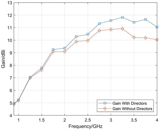 The antenna designed in this paper can maintain a good return loss at 0.9–4 GHz, lower than −10 dB, and achieve a gain of 15.2 dBi by loading the directors and metamaterials.