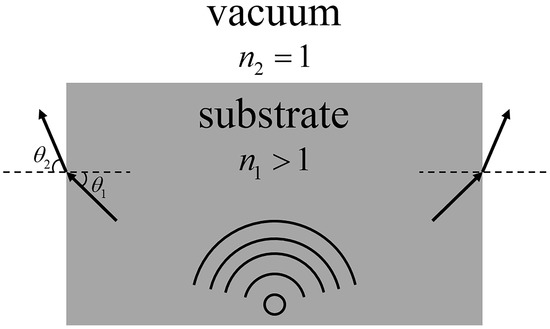 where and are the incident and refracted angles of the electromagnetic wave, and and are the refractive indices of the two media. When the refractive index of the medium, , is greater than that of air, (), according to Formula (2), it can be seen that the refracted angle, , is greater than the incident angle, . Therefore, the electromagnetic waves can be focused toward the normal direction of the interface, thereby achieving the effect of increasing the gain, as shown in Figure 7.