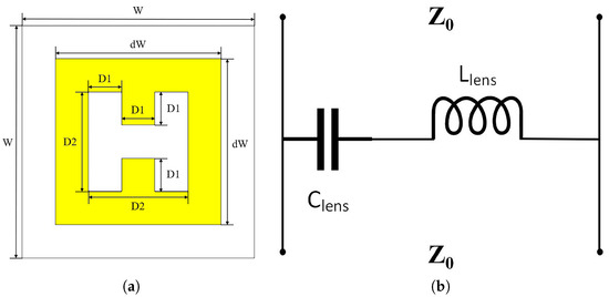 This article presents the design of periodic H-shaped metal patches printed on a 1.5 mm thick Rogers RT5880 substrate. Figure 8 shows the structure of the H-shaped artificial electromagnetic material unit and equivalent circuit diagram. The rectangular loop of the lens unit acts as the inductor , and the H-shaped gap acts as the capacitor and finally forms the equivalent series resonant circuit with lumped components. Table 2 provides the values of the various parameters of this unit. The simulation software CST Studio Suite is used for periodic simulation of the artificial electromagnetic material unit, and the S-parameter response of the structure is calculated using a frequency domain solver.