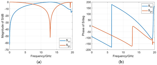 where n is the effective refractive index, k is the free space wave number, d is the effective substrate thickness, and are the simulated S-parameters, and z is the wave impedance. Since the S-parameters are complex, the obtained effective refractive index and wave impedance are also complex. The imaginary part of the refractive index represents the absorption of the electromagnetic wave by the medium, while the real part of the wave impedance represents the attenuation of the electromagnetic wave. Since the medium is a passive medium, the imaginary part of the effective refractive index must satisfy , and the real part of the wave impedance must satisfy . In order to satisfy the above conditions, Formula (4) is improved to eliminate the periodic inverse trigonometric function. Assuming that , Formula (3) can be expressed using Euler’s formula as follows: