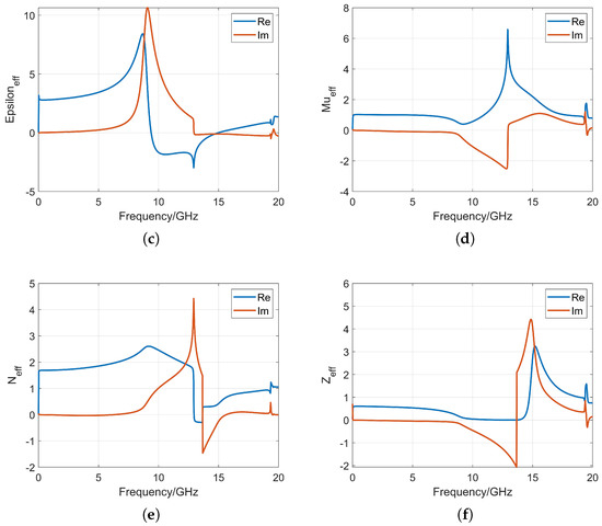 where m is the number of periods. By substituting the simulated S-parameters into Formula (7), the effective refractive index of the artificial electromagnetic materials can be obtained [21,22]. Figure 9 shows the simulated S-parameters, as well as the effective permittivity, effective permeability, effective refractive index, and wave impedance of the artificial electromagnetic material.