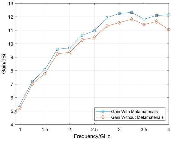 It can be seen that the “H”-shaped artificial electromagnetic material undergoes resonance at around 13 GHz and maintains a high stability in the frequency range of 0.5–6 GHz. For the required frequency band of 0.9–4 GHz, the “H”-shaped artificial electromagnetic material is in a non-resonant state, and the imaginary part of the effective refractive index is about 0, while the real part gradually increases from 1.68 to 1.78. Loading the metamaterials in front of the Vivaldi antenna aperture can be used to focus the beam and to improve the gain. The gain improvement effect obtained through simulation is shown in Figure 10.