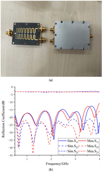 Physical diagram of the Wilkinson power divider and comparison of simulated and measured results. (a) Configuration of the Wilkinson power divider. (b) Simulated and measured reflection coefficients.