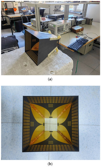 The proposed antenna array was fabricated, and the performance was measured using the vector network analyzer (E5063A) and the microwave anechoic chamber. The four Vivaldi units were fixed together using screws and were connected using conductive metal stickers, and the antenna prototype is shown in Figure 13a,b.