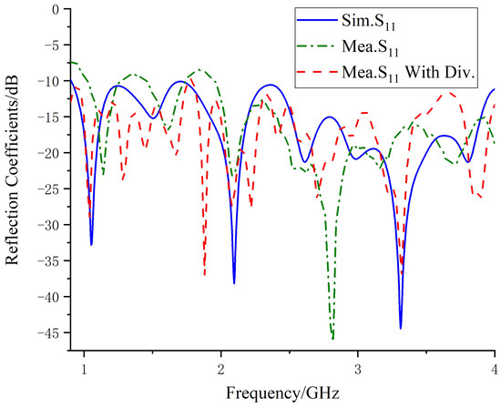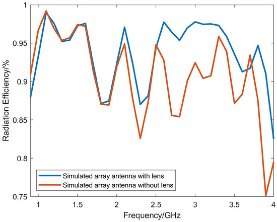 The reflection coefficients obtained through simulation and vector network analyzer measurements are shown in Figure 14. The blue solid line represents the simulated reflection coefficient of the Vivaldi array, the green dashed line represents the measured reflection coefficient of a single port without the power divider, and the red dashed line represents the reflection coefficient measured when the input of the power divider is connected to the vector network analyzer. One of the output ends is connected to the antenna port, and the other is connected to the matching resistor. By comparison, it can be seen that the loaded power divider did not have a significant impact on the reflection coefficient. Within the operating frequency range of 0.9–4 GHz, the reflection coefficient after loading the power divider is less than −10 dB. The discrepancy between the simulated S-parameters and the measured values may be due to errors in welding and manufacturing, as well as to the asymmetry of the three power divider welding resistors that caused unbalanced power feeding. In addition, the radiation efficiency of the final antenna array obtained by simulation is shown in Figure 15. It can be seen that loading artificial electromagnetic materials has little influence on the antenna radiation efficiency at low frequency, but it can improve the antenna radiation efficiency at high frequency. The maximum radiation efficiency of the antenna can reach at 1.1 GHz, and the minimum radiation efficiency is at 4 GHz.