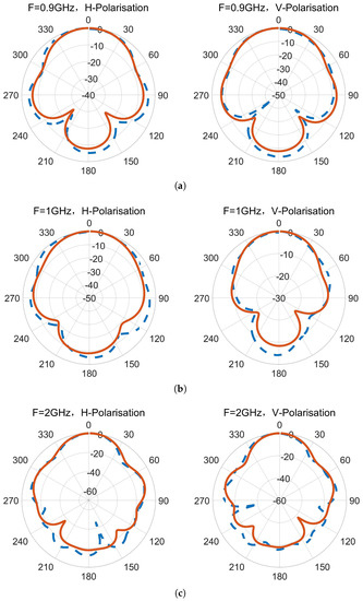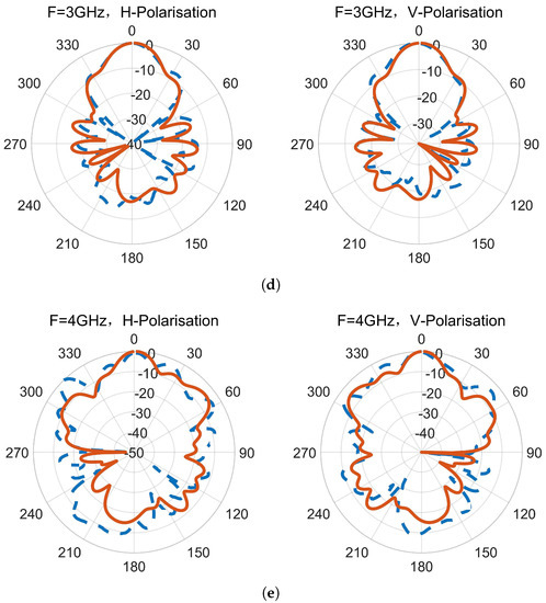 Normalized radiation patterns of H-polarization and V-polarization. (a) 0.9 GHz. (b) 1 GHz. (c) 2 GHz. (d) 3 GHz. (e) 4 GHz.