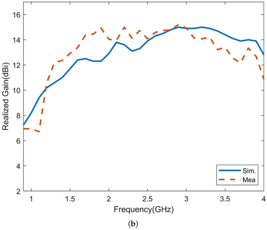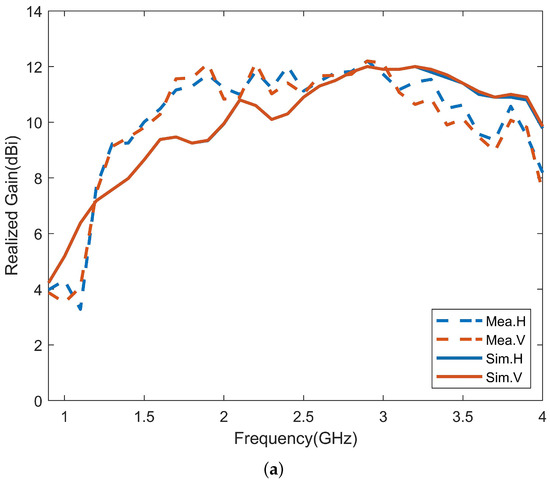 The radiation patterns and gain of the antenna were measured using the microwave anechoic chamber and were compared to the simulated results. Figure 16 shows the measured and simulated horizontal and vertical polarization radiation patterns at different frequencies, where the red solid line represents the simulated result, and the blue dotted line represents the measured result. The measured radiation patterns are generally consistent with the simulation results. Figure 17 compares the simulated and measured gains of the antenna, where Figure 17a shows the comparison of the gains for horizontal and vertical polarizations, and Figure 17b shows the comparison of the results for the maximum gain, which is the sum of the gains for horizontal and vertical polarizations. The measured gain is close to the simulated gain, and the maximum gain of the antenna is between 6.7 and 15.2 dBi.