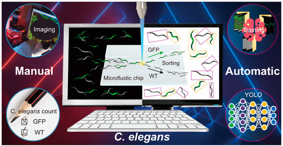 Computer vision can automate experimental processes to improve efficiency, enabling a fast response time and customization for multiple complex backgrounds [32,33,34,35,36]. Multiple computer vision techniques have shown good potential for the automated detection of C. elegans [37,38,39,40,41]. Based on deep learning algorithms, a real-time detector system has previously been developed for accurate worm localization, classification, and profile prediction, including the Mask region-based convolutional neural network (R-CNN), Faster R-CNN, and You Only Look Once (YOLO)v5 [41]. The latest version of YOLOv7 has been recognized as one of the most accurate and fastest real-time object detectors, making it ideal for optimizing applications in C. elegans. [42,43,44]. However, applications combining YOLOv7 with microfluidics are yet to be developed.