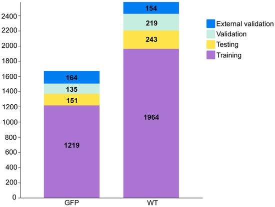 Numbers of annotated GFP and WT in the training, testing, validation, and external validation sets.