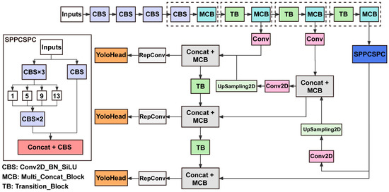 The overall structure is generic YOLO architecture. The backbone extracts the feature from the image. The neck enhances the feature map by combining different scales. The head provides the bounding box for detection. SPPCSPC, spatial pyramid pooling convolutional set pooling convolutional; Conv, convolution; Conv2D, two-dimensional convolutional layer; RepConv, reparameterized convolution; UpSampling2D, two-dimensional up-sampling layer; Concat, concatenate; CBS, Conv2D_BN_SiLU (convolutional standardization activation function); MCB, Multi_Concat_Block (multi-branch stacking module); TB, Transition_Block (transition block).