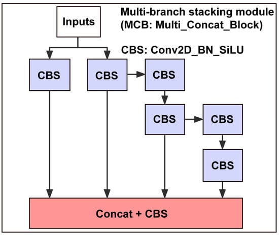 The overall structure of our model utilized multi-branch stacking modules, represented by the MCB in Figure 3 and illustrated in Figure 4. In this module, the input of the final stacking module contained multiple branches. From left to right, the four branches shown in Figure 4 consist of 1, 1, 3, and 5 CBS, respectively. After these branches were stacked, they conducted another CBS for feature integration. The dense stacking corresponded to a dense residual structure that included internal residual blocks. While increasing the depth of the neural network can optimize and improve model accuracy, it may lead to vanishing gradient problems. Internal residual blocks with skip connections can mitigate this issue.