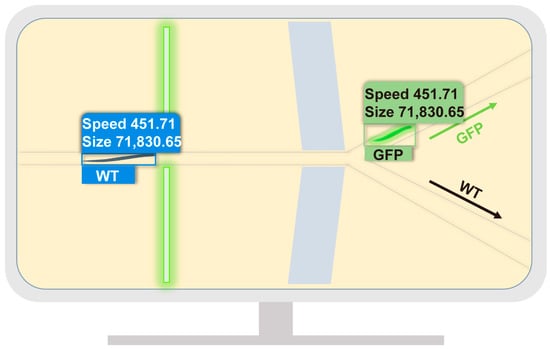 We applied our model to recognize C. elegans automatically in microfluidic chips from videos. The mixed populations of WT and GFP C. elegans were imaged in the microfluidic chips under an optical microscope. Our model could identify the fluorescent phenotype of these worms (WT or GFP) and calculate their size and speed (Figure 6). In practical application scenarios, microfluidic chips can be combined with our model to sort GFP and WT worms into different channels to obtain a single target population. Moreover, combined with different microfluidic chip designs, the size and speed output results can also serve as sorting criteria. As shown in Table 5, we employed twenty-eight worms for identification in our model, including twenty-four WT and four GFP worms from chip 1 (Worm1–11 and Worm25–28) and chip 2 (Worm12–24). The largest sized worm was 94,394.17 μm2 and the smallest sized was 11,547.36 μm2. The fastest worm had a speed of 2827.30 μm/s, while the slowest was 46.13 μm/s. Since the recognition was performed on videos, the speed 0 is invalid due to interference from the video frame rate. Variations in C. elegans’ movement speed may arise due to differences in video frame rates, air pump settings, and other experimental conditions of the microfluidic chips [68]. However, it is important to note that these factors do not invalidate the obtained results. On the contrary, they showcase the adaptability of our model to diverse microfluidic application environments, highlighting the robustness and effectiveness of our approach.
