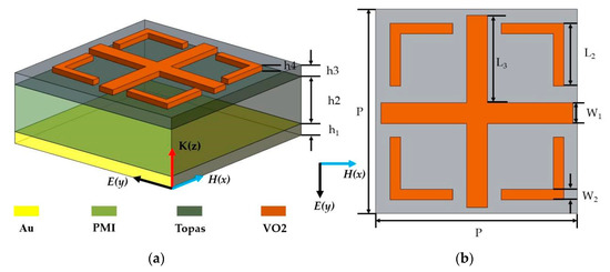 The structure diagram of our proposed vanadium-dioxide-based switchable absorber unit cell is shown in Figure 1, which consists of four layers: the lowermost structure is 0.2 µm of thick gold, which acts as a reflecting mirror to guarantee the complete reflection for the impinging terahertz wave, thereby suppressing the transmission; the second layer is a PMI (polymethacryl imide) layer with a relative permittivity of 1.1 [57]; the third layer is an insulating layer (Topas (cyclic olefin copolymer)) with a relative permittivity of 1.96, which is assumed to be lossless [58]; and the uppermost layer is a vanadium dioxide layer with a thickness of 200 nm. Figure 1b shows a top view of the unit cell structure with period p. The uppermost layer structure consists of a cross-like structure and four L-shaped dart-like structures. The optimal geometrical parameters were determined by analyzing the effect of the geometrical parameters on the absorption broadening, as shown in Table 1.