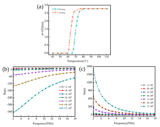 (a) The curve of VO2 conductivity as a function of ambient temperature; (b,c) real and imaginary parts of the relative permittivity of VO2 at different electrical conductivities.
