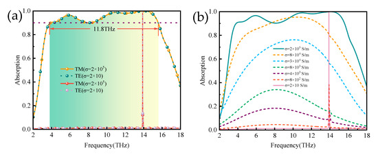 Through simulation, we calculated the absorption spectra of the absorber at different polarization modes (TE, TM) and different conductivities, respectively, as shown in Figure 3. From Figure 3a, when the VO2 is in the metal phase with a conductivity of 2 × 105 S/m, the absorption bandwidth of more than 90% absorption is observed to be 11.8 THz in the frequency range from 3.8 THz to 15.6 THz, with a central frequency of around 9 THz, and the absorber has the advantage of being polarization insensitive. When VO2 undergoes a phase transition from a metallic to an insulating state under the influence of temperature, the absorber switches from a broadband absorber to a narrowband absorber with elevated Q values. The absorber achieves an absorption of >99.99% at the electromagnetic frequency f = 13.89 THz with a quality factor of 1111.