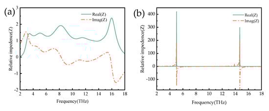 where S11, S21, Z, and Z0 are the S-parameters, effective impedance and free space impedance of the proposed absorber, respectively, and Zr = Z/Z0 represents the relative impedance. Formulas (4) and (5) can be obtained to make the metamaterial absorber x absorption rate reach the maximum. At this time, in free space impedance matching, Z and Z0 represent the equivalent impedance and free space impedance of the absorber, while Zr represents the relative impedance (Zr = Z/Z0 = 1); Figure 4 shows the real and imaginary parts of the relative impedance of the metallic and insulating absorber under TE polarization. In Figure 4a, when VO2 is in the metallic state, the real part is close to 1, and the imaginary part is close to 0 in the frequency range of 3.8~15.6 THz. In this frequency range, the absorber’s impedance and the free’s impedance are already adequately matched. When the electromagnetic wave is incident to the absorber, the reflected wave is approximately 0, and most of the energy is lost in the insulating layer, thus achieving perfect absorption.