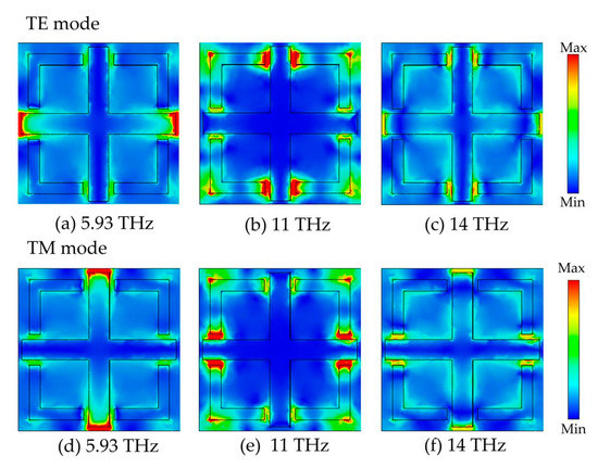The electric field intensity distribution of the designed metamaterial wideband absorber at a frequency of 5.93 THz, 11 THz, and 14 THz; (a–c) for the TE mode and (d–f) for the TM mode.
