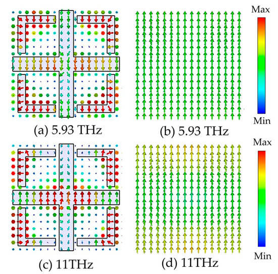 Figure 6 shows the current distribution on the surface of the top VO2 resonant layer and the bottom metallic layer at two resonant frequencies of 5.93 and 11 THz when VO2 is in the metallic state. At 3.5 THz, the direction of the surface current on the top VO2 resonance structure is inversely parallel to the direction on the bottom metal layer. The middle part of the dielectric layer is treated as a magnetic dipole, forming a strong magnetic resonance. At a frequency of 11 THz, a portion of the surface current direction on the top VO2 resonant structure is parallel to that on the bottom metal layer, when an electrical resonance is also induced. Thus, under the excitation of magnetic and electrical resonances, the incident electromagnetic waves are extremely suppressed in the resonator, leading to broadband absorption properties.