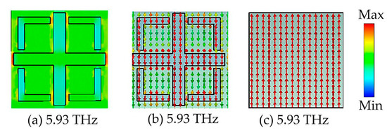 Distribution of electric fields and currents at 13.88 THz in narrowband absorption; (a) electric field distribution diagram; (b) surface current distribution diagram; (c) bottom surface current distribution diagram.