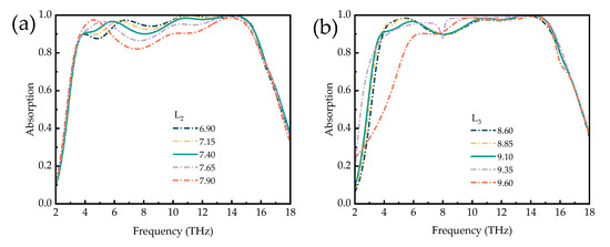Influence of the (a) length L2 of the cross-like structure and (b) length L3 of the L-shaped, dart-like structure based on VO2 on the absorption spectrum.