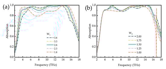 To investigate the effect of the geometric structure parameter on the results, it is necessary to verify the effect of the geometric structure parameter on the absorber. One parameter is analyzed for simplicity, while the additional parameters are fixed. Figure 8 shows the effect of the length of the cross-shaped structure and the length of the L-shaped dart on the absorption spectra, respectively. In Figure 8a, as the L-shaped dart length b keeps increasing, the absorption spectrum shifts slightly at low frequencies, but the absorption intensity gradually decreases. Finally, the x absorption spectrum with a maximum absorption more significant than 90% is obtained at L2 = 7.4 μm. In Figure 8b, with the increasing length of the cross-type, the absorption peak at low frequencies gradually shifts blue, and the absorption intensity gradually decreases with the increasing length, which is caused by the coupling effect between adjacent unit structures. The effects of the cross-shaped structure k-width and L-shaped dart width on the absorption spectra are shown in Figure 9a,b, respectively. In Figure 9a, with the increasing length of W1, the absorption peaks with >90% absorption at low and high frequencies are red-shifted and blue-shifted, respectively, but the absorption intensity gradually increases, and finally, the absorption broadband is at its maximum at W1 = 2.8 μm. In Figure 9b, with the gradual increase in the L-shaped dart width, the position of the absorption peak at elevated frequency gradually shifts blue, and the absorption intensity gradually decreases. In summary, the best effect of the absorption bandwidth can be obtained by adjusting the geometric parameters of the structure. It will have important implications for practical fabrication.
