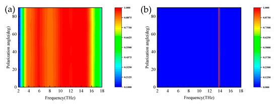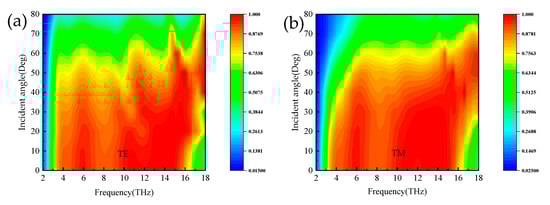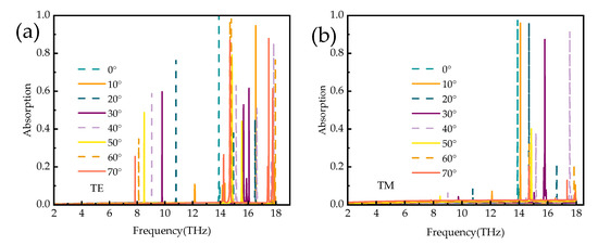 In practice, a major factor in evaluating absorber properties is the absorption properties at different polarization angles and incidence angles. Figure 10a,b show the absorption spectra of the proposed absorber for normal incident waves at broadband and narrowband with polarization angles ranging from 0° to 90°. As seen from the plots, the absorption spectrum remains constant; thus, this absorber has the advantage of polarization insensitivity. Figure 11a,b show the absorption spectra of the broadband absorber under TE and TM polarized waves, respectively. When the incidence angle is less than 25°, the absorber has superior absorption characteristics in the range of 3.8–15.6 THz. The blue shift occurs when the incidence angle is 25° to 52°, with superior absorption characteristics in the field of 3.8–18 THz. In the TM mode in Figure 12b, when the incidence angle is greater than 40°, the absorption rate will blue-shifted; however, when the incidence angle is less than 55°, the absorber shows superior absorption characteristics. The absorption rate of the absorber in the TM and TE modes will be blue-shifted with the increasing incidence angle. The main reason is that the tangential component of the electric field decreases as the incidence angle increases. Remarkably, the bandwidth of the incidence angle widens with increasing incidence angle. This is because the TE polarization produces different absorption peaks at extreme frequencies, resulting in the broadening of the absorption bandwidth. For TM polarization, the absorption peak is significantly blue-shifted at high frequencies, resulting in a wider absorption bandwidth. Figure 12 shows the absorption spectra of the narrowband absorber in TE and TM modes at different incidence angles when vanadium dioxide is in the insulating state. In Figure 12a, with the increase in the incidence angle, the absorption spectrum gradually blue-shifts, the absorption rate is lower at the low frequency, and the absorption rate is higher in the range of 60°. In Figure 12b, the absorption spectrum also blue-shifts with increasing incidence angle in TM mode and maintains a high absorption peak in the range of 50°. As a narrowband absorber, it has a high incidence angle to maintain a high absorption rate in both modes, which increases the application value of the device.