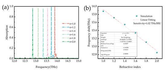 Since the sensor designed in this paper is a broadband and narrowband tunable absorber, we additionally evaluated the performance of the narrowband sensor absorber to consider practical applications of the sensor. Figure 13 shows the absorption spectrum of the narrowband absorber as a function of the refractive index of the surrounding environment. Figure 13a shows that the position of the narrowband absorption peak is red-shifted with the increasing refractive index. Sensitivity (S) is commonly used to evaluate the sensing performance of narrowband absorbers. In general, the sensor sensitivity is defined as shown in Equation (6). In addition, the FOM value reflects the influence factor bandwidth, which is also one of the critical metrics to reflect the sensor performance and is calculated as shown in Equation (7).