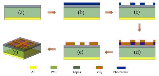 Absorber process flow diagram; (a) preparation of the bottom gold and PMI dielectric layers; (b) photoresist coating; (c) exposure, development; (d) sputtered precipitated vanadium dioxide layer; (e) release photoresist; (f) absorber samples.