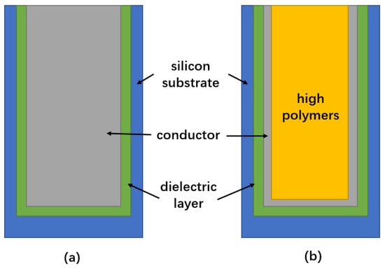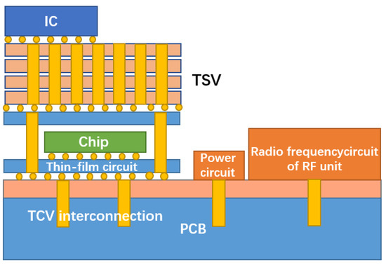 Three-dimensional (3D) integration has the advantages of low power consumption, small form factor, high performance and high functional density [1,2,3,4]. It can meet the interconnection requirements of low latency and low power consumption by shortening the interconnection length [5,6,7,8]. A circuit diagram is shown in Figure 1 [9]. As early as 2010, the European Union launched the Best-Reliable Ambient Intelligent Nano Sensor Systems (E-BRAIN) and carried out research on 3D micro-system integration technology with 3D vertical interconnection as its core, with the aim to develop reliable and high-yield wafer-level 3D stacked integration technology [10]. Among them, through-silicon via (TSV) technology has become the key to the development of 3D packaging technology [11]. TSV technology refers to the processing of micro-vias on the silicon wafer and filling conductive materials in the silicon wafer. Through TSV technology, vertical interconnection between chips, integration and data transmission between homogeneous or heterogeneous chips can be realized, which can significantly improve device performance and the integration of a single device. Compared with traditional lateral interconnects, TSV structures have the shortest path in the vertical direction; this characteristic not only shortens the signal transmission path, reduces the transmission resistance and reduces the generation of heat but also improves the high-frequency performance of the chip. On the other hand, this vertical structure effectively reduces the area of interconnect structures on the chip. Under the same area, the stack structure formed by TSV has higher performance and more functionality [12]. TSV is not only widely used in the field of information technology but also has potential in the design and production of future mainstream devices [13]. In view of the wide application of stereoscopic integration in the dual-use market, China has strongly supported stereoscopic integration technology based on TSV [14]. In 2011, China established the TSV technology research consortium to vigorously promote the industrialization of civil TSV technology. At present, the main TSV research units carry out “via-last” technology research. The research on TSV 3D integration has been supported by basic scientific research, microelectronics, sophisticated manufacturing, and very large-scale integrated circuit production technologies [15]. A study [16] conducted by French consulting firm Yole Development found that TSV can be applied to almost any chip package and any type of advanced package, including light emitting diodes (LED) and micro-electro-mechanical systems (MEMS). It was reported by the Fraunhofer Institute in Germany that inertial MEMS chips and integrated circuit (IC) chips with corresponding functions can be assembled on the 2.5D TSV adapter board by using the processes of redistribution layer (RDL), micro bump and flip chip bonding, which provides a technical approach for 3D integration of inertial micro-system and a design architecture space for integrating more functional chips.