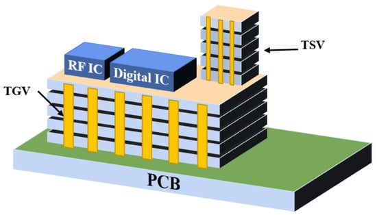In recent years, 3D integrated packaging has become the main direction of advanced packaging development, and most 3D integration uses silicon as the substrate. However, research institutions, such as the Georgia Institute of Technology, have used glass as the substrate to realize 3D integration. Figure 3 is a schematic diagram of the system-in-package based on a glass transfer plate described by the Georgia Institute of Technology [19]. Through glass via (TGV) technology has the advantages of high-density interconnection and low-loss transmission, which forms a highly reliable interconnection between the chip and the substrate, has higher I/O density and smaller spacing, and realizes passive on-chip devices, high-density copper interconnection and the heterogeneous integration of chips. Therefore, 3D integration and system-level packaging technology have developed rapidly [20]. By utilizing TGV technology and new design technology, it is possible to build miniaturized new devices and integrated 3D radio frequency (RF) microsystems.