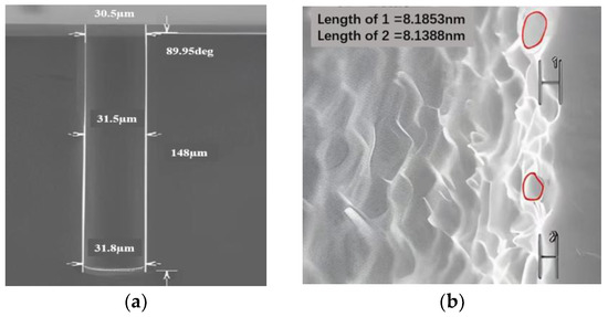 Scallops on the top side wall of the hole, with an opening of 80 μm (a) before optimizing DRIE parameters, the maximum width and depth of scallop were 3.41 μm and 959 nm, respectively; (b) the optimized DRIE parameters: the maximum width and depth of scallop are 2.13 μm and 540 nm, respectively (Reprinted with permission from Ref. [52], 2022, Feng, Liuhaodong).