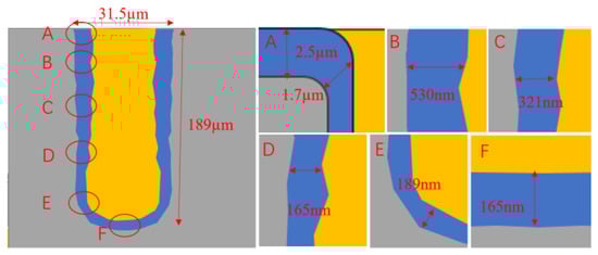 The insulating layer in the TSV hole is used to insulate the silicon substrate from the transmission channel in the hole, which effectively reduces the signal distortion and crosstalk caused by the signal leaking from the conductive metal to the silicon substrate. The quality of the sidewall isolation layer has become a main concern. The failure of the insulating layer may lead to leakage or other reliability problems, which directly affect the yield of silicon-based devices [28]. The methods of dielectric layer deposition mainly include high-temperature thermal oxidation, physical vapor deposition (PVD) and chemical vapor deposition (CVD), among which CVD includes plasma enhanced chemical vapor deposition (PECVD) and sub-atmospheric pressure chemical vapor deposition (SACVD) [29]. These two vapor deposition methods can meet the requirements of efficiency and shaping coverage when depositing silicon dioxide. Figure 7 shows the SEM cross-sectional view of SiO2 dielectric layer prepared in the TSV hole. In the figure, A to F are the deposition effects at different positions of the hole. It can be seen that the thickness of the SiO2 dielectric layer at the top of the TSV hole is relatively large. It gradually decreases after depositing the SiO2 film along the inner wall of the hole to the lower wall of the hole. Furthermore, the hole is completely covered with SiO2 dielectric material, and there is no missing area of SiO2 [30].